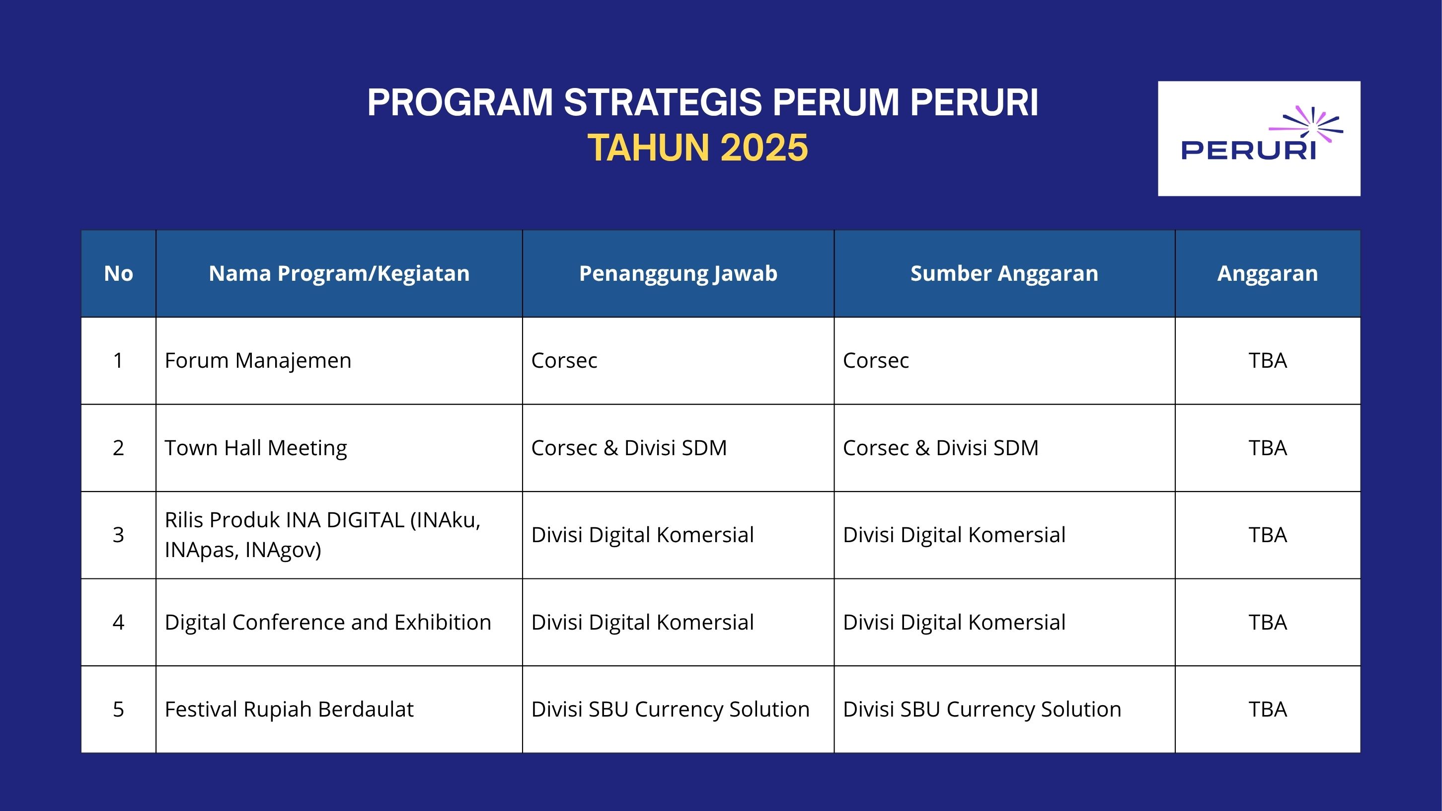 30 Juli 2025PERURI menandatangani Perjanjian Kerja Sama dengan Jaksa Agung Muda Bidang Perdata dan Tata Usaha Negara (JAMDATUN) sebagai upaya memperkuat tata kelola perusahaan dan menjamin kepastian hukum dalam bisnis. Kerja sama ini menjadi fondasi bagi PERURI untuk menjadi entitas teknologi high security yang tangguh dan tepercaya.